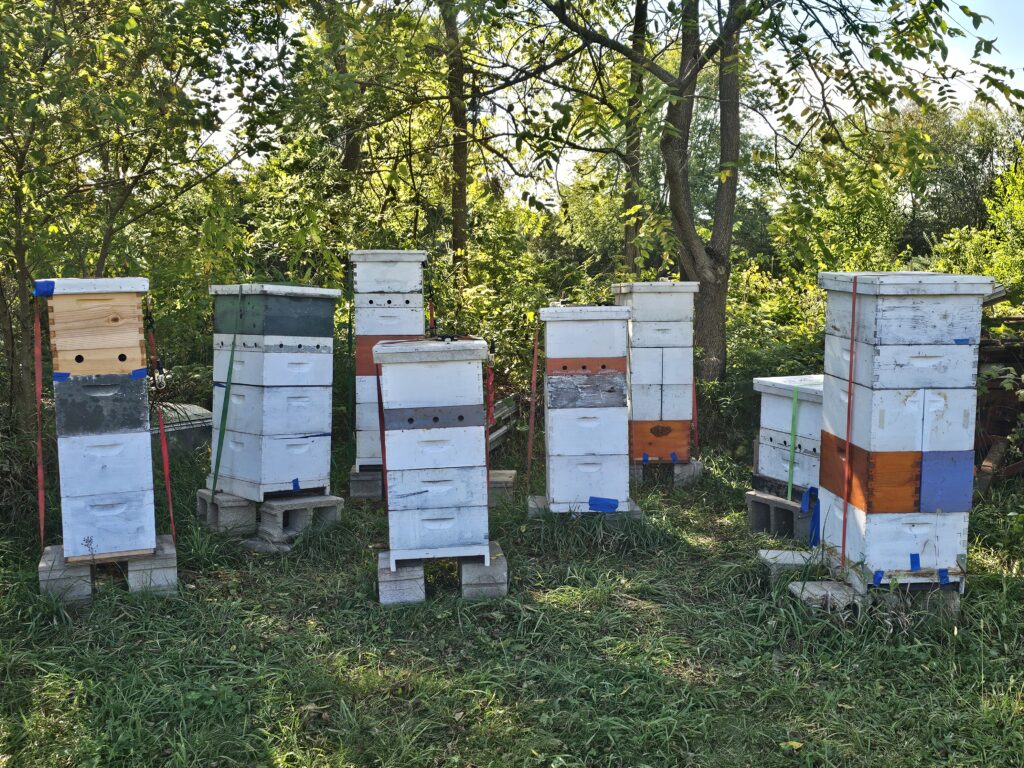 We started with 3 hives and 1 nucleus (nuc) beginning of 2022 in the new location. The bees did well over that winter. The apiary grew a little so that by Nov 2023 there were 3 hives and 3 nucs. 2 were weak, and I suspected they wouldn’t make it over the winter. Unfortunately, none made it over the winter. We re-started April 2024 with 2 colonies and 2 side by side nucs. 1 is named wax and 2 is named wane, because they were installed during the solar eclipse. July 2024 they were combined into one hive. 3 (Pinky) did not do well and in July 2024 they left the apiary. 4 (Rainy) an AFB vaccinated queen from Maryland joined the apiary also in April and 5 (Jim´s Swarm) was captured in May 2024. The apiary did well over the winter 2024 – 2025. Come Spring of 2025 we added 4 colonies from Wisconsin, and split 2 hives. We lost a WI queen, and we lost a queen from one of the splits. The bees decided they wanted to make their own queens instead of the ones I gave them, so I had to let them do their thing. It did mean that honey production was not as high as I had hoped but, such is bee life. We added 2 swarms to the happy little apiary and late season 2025 2 more swarms were added. The swarms are the wild cards. We do everything we can to make their survival possible but fear the odds are against two of them; One that came earlier in the season, and 1 from the late season. Soon it´s treatment time and then they´ll be ready for their wintertime cluster.