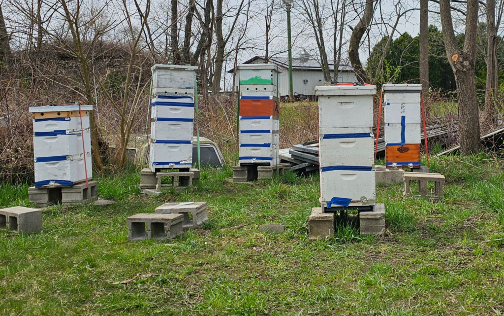 We started with 3 hives and 1 nucleus (nuc) beginning of 2022 in the new location. The bees did well over that winter. The apiary grew a little so that by Nov 2023 there were 3 hives and 3 nucs. 2 were weak, and suspected they wouldn’t make it over the winter. Unfortunately, none made it over the winter. We re-started April 2024 with 2 colonies and 2 side by side nucs. The apiary did well over the winter 2024 – 2025. Come Spring of 2025 we added 4 colonies from Wisconsin, and split 2 hives. The bees decided they wanted to make their own queens instead of the ones we gave them with the splits, so we had to let them do their thing. It did mean that honey production was not as high as hoped but, such is bee life. We added 2 swarms to the happy little apiary and late season 2025 2 more swarms were added. The swarms are the wild cards. We do everything we can to make their survival possible but fear the odds are against two of them. Now the bees are ready for their wintertime cluster. We do worry about them over the winter, but there is nothing we can do but hope that we did our best to put all the odds in their favor.